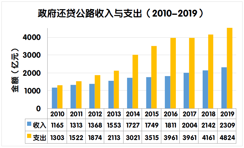 2019年度全國(guó)收費(fèi)公路通行費(fèi)收支缺口比上年增加780.4億元,增長(zhǎng)19.2%。主要原因是2019年度通行費(fèi)支出總額較上年增加。一是2019年度部分收費(fèi)公路債務(wù)到期,償還債務(wù)本金支出較上年凈增525.9億元;二是隨著債務(wù)規(guī)模的擴(kuò)大,償還利息支出凈增169.0億元;三是新建ETC門架系統(tǒng)、改造ETC車道、安裝入口不停車稱重檢測(cè)系統(tǒng)、省界收費(fèi)站正線設(shè)施改造工程等支出。