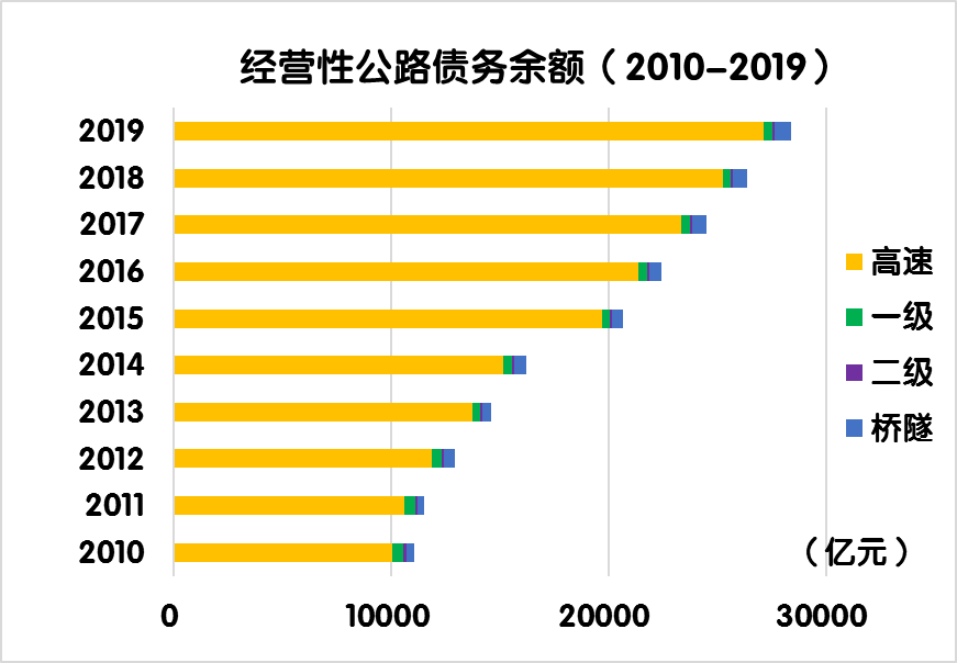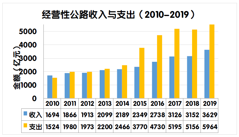 2019年度,全國(guó)經(jīng)營(yíng)性公路收支平衡結(jié)果為-2334.9億元。其中,經(jīng)營(yíng)性高速公路收支缺口2284.7億元,一級(jí)公路收支缺口53.1億元,二級(jí)公路收支缺口3.7億元,獨(dú)立橋梁及隧道收支盈余6.6億元。