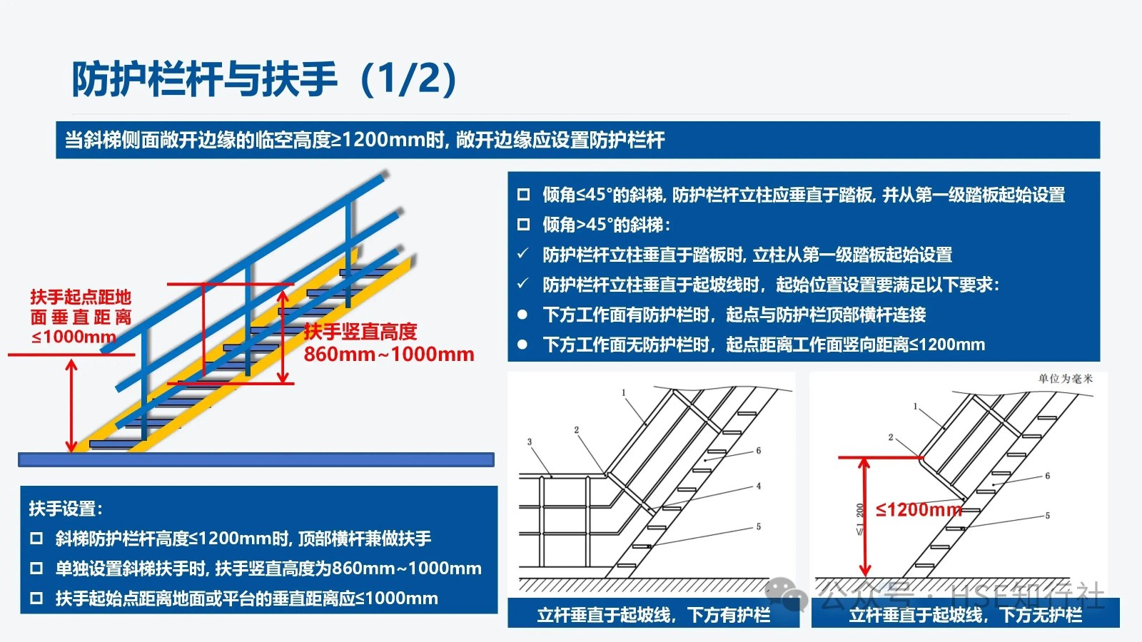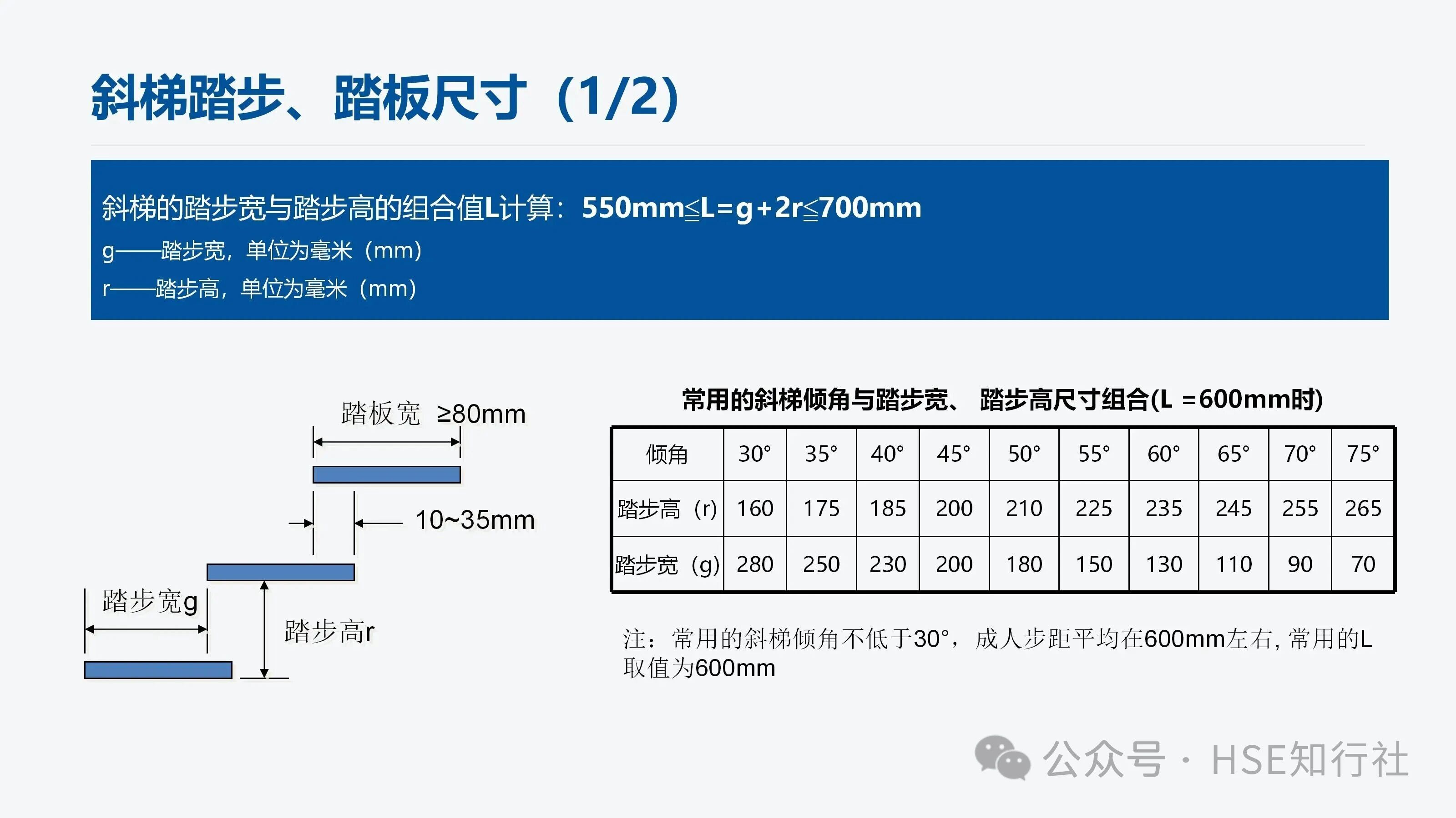 適用范圍 適用于工業(yè)企業(yè)內(nèi)工作場所中使用的固定式金屬斜梯的設(shè)計(jì)、制造和安裝。不適用于安裝在核設(shè)施、船舶、 起重機(jī)械、輸電塔上的固定式金屬斜梯。 傾角、梯段高度、通行空間、凈寬度要求 傾角、梯段高度要求: 梯段高度≤6m;總高度>6m,應(yīng)分段設(shè)梯。 總高度≤6m,不用分段設(shè)梯。 通行空間要求: 凈空高度:H1≥2000mm,作為疏散通道時(shí),凈空高≥2100mm 斜梯坡度線到上方障礙物的最小距離S: 傾角≤45°時(shí), S≥1200mm 傾角>45°時(shí), S≥850mm 斜梯內(nèi)側(cè)凈寬: 偶爾單向通行, 內(nèi)側(cè)凈寬應(yīng)≥500mm 經(jīng)常性雙向通行, 內(nèi)側(cè)凈寬應(yīng)≥1000mm 螺旋梯內(nèi)側(cè)進(jìn)寬: 內(nèi)側(cè)凈寬應(yīng)≥650mm 注:“偶爾”指使用頻率每年低于30天且每天低于2h。 傾角要求: 優(yōu)選傾角:30°~35° 經(jīng)常雙向通行最大傾角:38° 偶爾通行的最大傾角:42° 斜梯踏步、踏板尺寸 平臺(tái)設(shè)置要求: 1、斜梯的踏步寬與踏步高的組合值L計(jì)算: 550mm≦L=g+2r≦700mm g——踏步寬,單位為毫米(mm) r——踏步高,單位為毫米(mm) 2、常用的斜梯傾角與踏步寬、踏步高尺寸組合(L =600mm時(shí)): 傾角 30° 35° 40° 45° 50° 55° 60° 65° 70° 75° 踏步高(r) 160 175 185 200 210 225 235 245 255 265 踏步寬(g) 280 250 230 200 180 150 130 110 90 70 注:常用的斜梯傾角不低于30°,成人步距平均在600mm左右, 常用的L取值為600mm。 3、不同踏板形式的踏板寬度、相鄰踏板水平投影長度也不相同,具體如下: 踏板之間封閉: 踏板之間不封閉: 踏板之間不封閉,但踏板有凸起: 非螺旋梯的踏板寬度≥80mm,同一梯段踏板寬度應(yīng)保持一致。 相鄰踏板之間由垂直板件封閉時(shí), 或踏板的踩踏面前方有凸起時(shí), 踏板寬度≥170mm。 相鄰踏板水平投影重疊長度: 1、垂直板件封閉時(shí), 重疊長度≥0mm 2、垂直板件未封閉時(shí), 重疊長度10mm~35mm 注:踏板的踩踏面應(yīng)采用防滑材料或有不小于25mm 寬的防滑突沿,采用花紋板、經(jīng)防滑處理的金屬板、格柵板等。 螺旋梯踏步、踏板尺寸 距離螺旋梯扇形踏步窄邊300mm處的踏步寬應(yīng)不小于170mm。 螺旋梯的踏步高應(yīng)在160mm~240mm范圍內(nèi)。 螺旋梯同一梯段踏板的平面投影圓心角應(yīng)保持一致(梯段頂部踏板除外)。 防護(hù)欄桿與扶手 防護(hù)欄桿設(shè)置: 當(dāng)斜梯側(cè)面敞開邊緣的臨空高度≥1200mm時(shí), 敞開邊緣應(yīng)設(shè)置防護(hù)欄桿。 傾角≤45°的斜梯, 防護(hù)欄桿立柱應(yīng)垂直于踏板, 并從第一級(jí)踏板起始設(shè)置。 傾角>45°的斜梯: 1、防護(hù)欄桿立柱垂直于踏板時(shí), 立柱從第一級(jí)踏板起始設(shè)置。 2、防護(hù)欄桿立柱垂直于起坡線時(shí),起始位置設(shè)置要滿足以下要求: 下方工作面有防護(hù)欄時(shí),起點(diǎn)與防護(hù)欄頂部橫桿連接。 下方工作面無防護(hù)欄時(shí),起點(diǎn)距離工作面豎向距離≤1200mm。 立桿垂直于起坡線,下方有護(hù)欄 立桿垂直于起坡線,下方無護(hù)欄 扶手設(shè)置: 扶手設(shè)置主要根據(jù)斜梯的傾角、斜梯的梯寬來設(shè)置,設(shè)置要求如下圖: 斜梯防護(hù)欄桿高度≤1200mm時(shí), 頂部橫桿兼做扶手。 單獨(dú)設(shè)置斜梯扶手時(shí), 扶手豎直高度為860mm~1000mm。 扶手起始點(diǎn)距離地面或平臺(tái)的垂直距離應(yīng)≤1000mm。 梯間平臺(tái)與門 梯間平臺(tái): 1、梯間平臺(tái)寬度應(yīng)不小于梯子寬度, 對(duì)斜梯應(yīng)不小于760mm 。 2、梯間平臺(tái)在行進(jìn)方向上的長度應(yīng)不小于梯子寬度, 對(duì)斜梯應(yīng)不小于850mm。 3、梯間平臺(tái)要符合GB4053.3—2025的規(guī)定。 自閉門: 1、自行關(guān)閉、保持在關(guān)閉位置但不鎖定。 2、采用平開方式向平臺(tái)內(nèi)打開、打開角度不小于 90°。 3、關(guān)閉時(shí)由擋塊阻擋,防止人員推開發(fā)生墜落或其他意外傷害。 4、不設(shè)置踢腳板、底部距離平臺(tái)高度為120mm~500mm。 5、自閉門要符合GB4053.3—2025的規(guī)定。 荷載 梯梁、踏板、頂部橫桿、中間桿、立柱荷載如下: 1、梯寬<1200mm 時(shí), 非螺旋梯踏板應(yīng)承受跨中100mm×100mm 區(qū)域上作用≥1.5kN集中活荷載。 2、梯寬梯寬≥1200mm時(shí), 非螺旋梯踏板應(yīng)承受跨中間隔600mm的兩100mm×100mm區(qū)域上同時(shí)作用≥1.5kN集中活荷載。 3、螺旋梯的踏板應(yīng)承受靠近外側(cè)邊緣100 mm×100mm 區(qū)域上作用不小于1.5kN 集中活荷載。 使用說明和警示信息 斜梯的使用說明和警示信息,主要從“斜梯的使用說明”、“斜梯的警示信息”、“自閉門的警示信息”三方面來完善,同時(shí)涉及到的安全色和安全標(biāo)志應(yīng)符合 GB2894 的規(guī)定。 1、斜梯的使用說明,包括但不限以下內(nèi)容: a) 斜梯、平臺(tái)的最大允許荷載.。 b) 自閉門的安全使用信息。 c) 維護(hù)和檢查的要求。 需要設(shè)計(jì)、制造方提供使用說明。 2、斜梯的警示信息,包括但不限以下內(nèi)容: a)最大荷載信息(包括允許的最大負(fù)載人數(shù)、工具和裝備等最大附加荷載)。 b)人員攀登時(shí)的安全要求(例如當(dāng)心墜落、必須戴安全帽等)。 3、自閉門的警示信息,包括但不限以下內(nèi)容: a)禁止倚靠的信息。 b)小心墜落的信息。 c) 提示非通行狀態(tài)保持