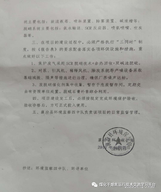 4、原襄汾縣環(huán)境保護局關于山西省襄汾縣宏源煤焦化工有限公司一車間、二車間焦化項目焦爐尾氣脫硫、脫硝綜合改造工程建設項目環(huán)境影響報告表的審批意見書
