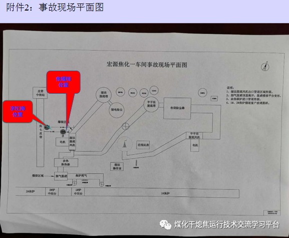 根據(jù)焦爐煙道氣脫硫脫硝系統(tǒng)配電室引風機變頻器的運行記錄顯示,9月8日8時54分左右山西省襄汾縣宏源煤焦化工有限公司一車間焦爐煙道氣濕法脫硫系統(tǒng)引風機停止運行,9時04分左右工段長張耀剛安排操作工董副紅在電腦上啟動引風機,自己去引風機處觀察情況,隨后在對講機中通知董副紅引風機已啟動,要求提高轉速。操作工董副紅聽到指令后進行加速, 9時06分左右引風機出口處管道發(fā)生爆炸;董副紅在對講機中聽到有人喊停風機,于是他就在電腦上進行了停止引風機運行操作,隨后撤離到安全地帶,但此時引風機并未停止運行。大約9時22分左右,脫硝反應器又發(fā)生爆炸,造成脫硝反應器及周邊設備設施嚴重損壞;9時31分由電氣主任王斌電話通知配電室值班電工斷開煙道氣濕法脫硫引風機電源停引風機。現(xiàn)場發(fā)生爆炸后,一車間經(jīng)理祁建軍、生產(chǎn)部長張建飛、煉焦副主任雷敬禹先后趕到引風機處檢查,在引風機北側發(fā)現(xiàn)張耀剛躺在地上,隨即將張耀剛抬至路邊,然后通知救護車,9時56分左右將張耀剛送至醫(yī)院進行救護?,F(xiàn)場人員全部撤離,在清點人數(shù)時發(fā)現(xiàn)設備主任李江濤找不見且聯(lián)系不上,張建飛帶領員工再次進入現(xiàn)場進行搜尋,在引風機西北側焦7皮帶走廊外墻根處的一塊爆炸飛出的管道鋼板下發(fā)現(xiàn)了李江濤,11時44分左右將李江濤送往醫(yī)院搶救。以上兩名傷者均搶救無效死亡。