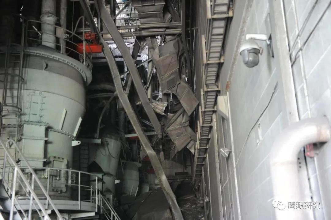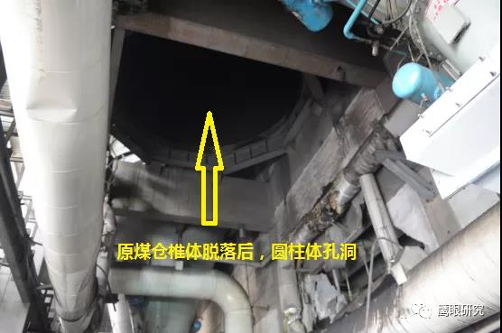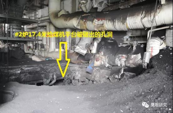 現(xiàn)場(chǎng)檢查,#2爐2D原煤倉(cāng)下部錐體部脫落,砸壞2D給煤機(jī)平臺(tái),連同給煤機(jī)墜落至#2鍋爐零米,2D給煤機(jī)損壞、2C、2D磨煤機(jī)油站、2D磨煤機(jī)、給煤機(jī)附近區(qū)域電纜、輔汽聯(lián)箱管道等設(shè)備不同程度受損,無(wú)人員傷害及主設(shè)備損壞。(堵煤次數(shù)太多,敲塌了?)